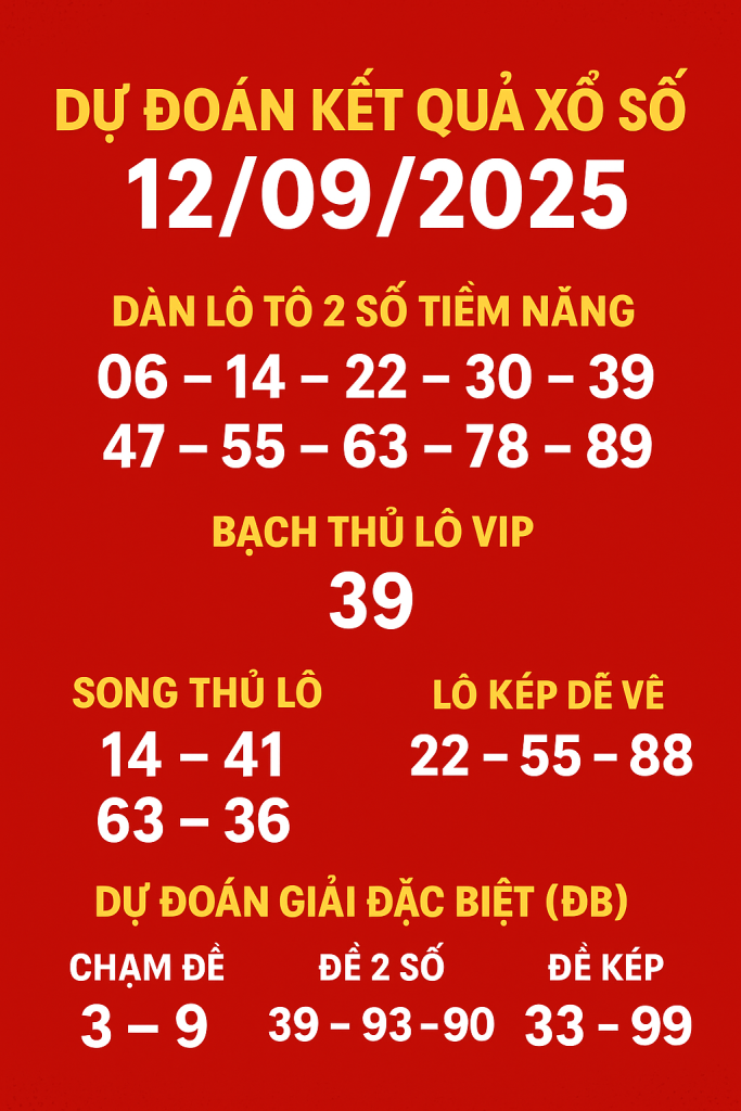 👉 Trên đây là bài dự đoán xổ số ngày 12/09/2025 với những con số sáng giá nhất. Anh em nên tham khảo, cân nhắc chọn số hợp lý và luôn nhớ chơi văn minh – giải trí là chính.