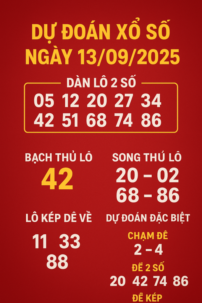 Xin chào toàn thể anh em đam mê con số! Hôm nay mình xin gửi đến bài dự đoán kết quả xổ số ngày 13/09/2025, với những con số đẹp được chọn lọc dựa trên phân tích cầu lô, tần suất và quy luật nổ số gần đây.
